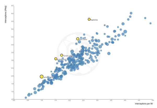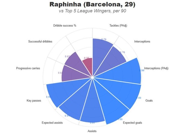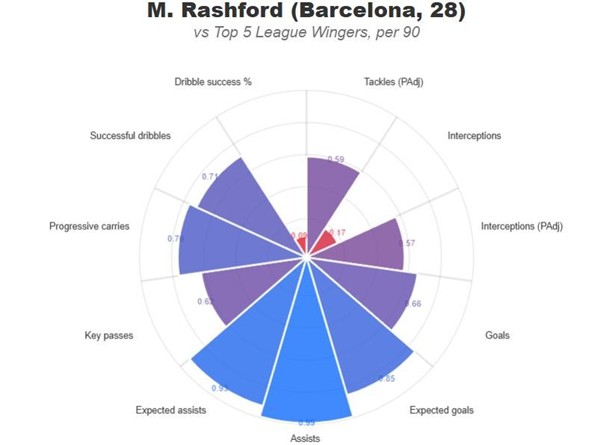 zdrowotnych. Jednakże, z nadejściem posuchy strzeleckiej, wychowanek Manchesteru United przestał dawać argumenty by na niego stawiać. Począwszy od braku nici porozumienia z resztą drużyny na boisku, poprzez słabą pracę w pressingu i w defensywie, kończąc na fatalnej skuteczności i bezbarwnych wejściach z ławki rezerwowych. Porównanie na liczbach obydwu skrzydłowych dobitnie pokazuje różnice klas oraz formy, gdzie Raphinha jest zawodnikiem ze światowego topu, natomiast Rashford piłkarzem z odzysku. Najbardziej uderzająca jest sekcja statystyk stricte defensywnych, czyli tackles (PAdj), interceptions i interceptions (PAdj). Pozwalają one zrozumieć i przedstawić namacalnie, ile piłkarz realnie wykonuje pracy w zadaniach defensywnych, ponieważ statystyki te są dostosowane i wyliczone na podstawie posiadania piłki. Anglik nie pracuje bez piłki, a jego praca z piłką pozostawia wiele do życzenia.