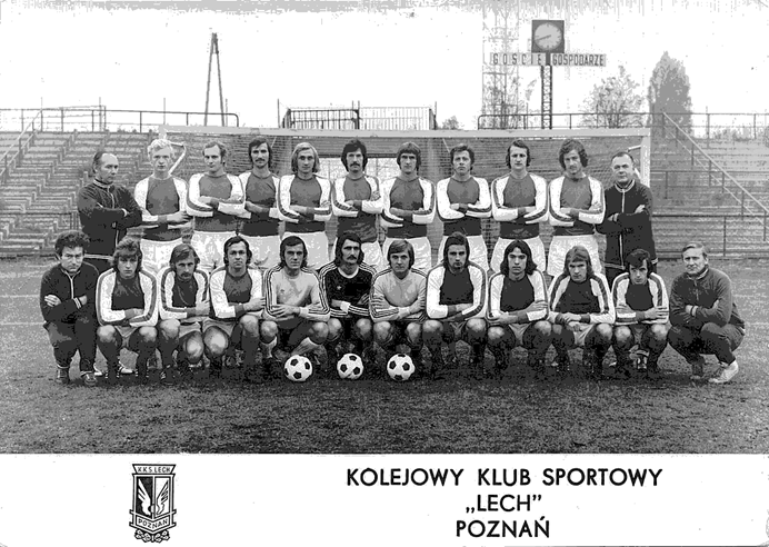 Lech Poznań w sezonie 1975/1976, kiedy Szewczyk strzelił 5 bramek w 27 meczach. Piłkarz stoi 4 od lewej, fot:Klub Kolekcjonera