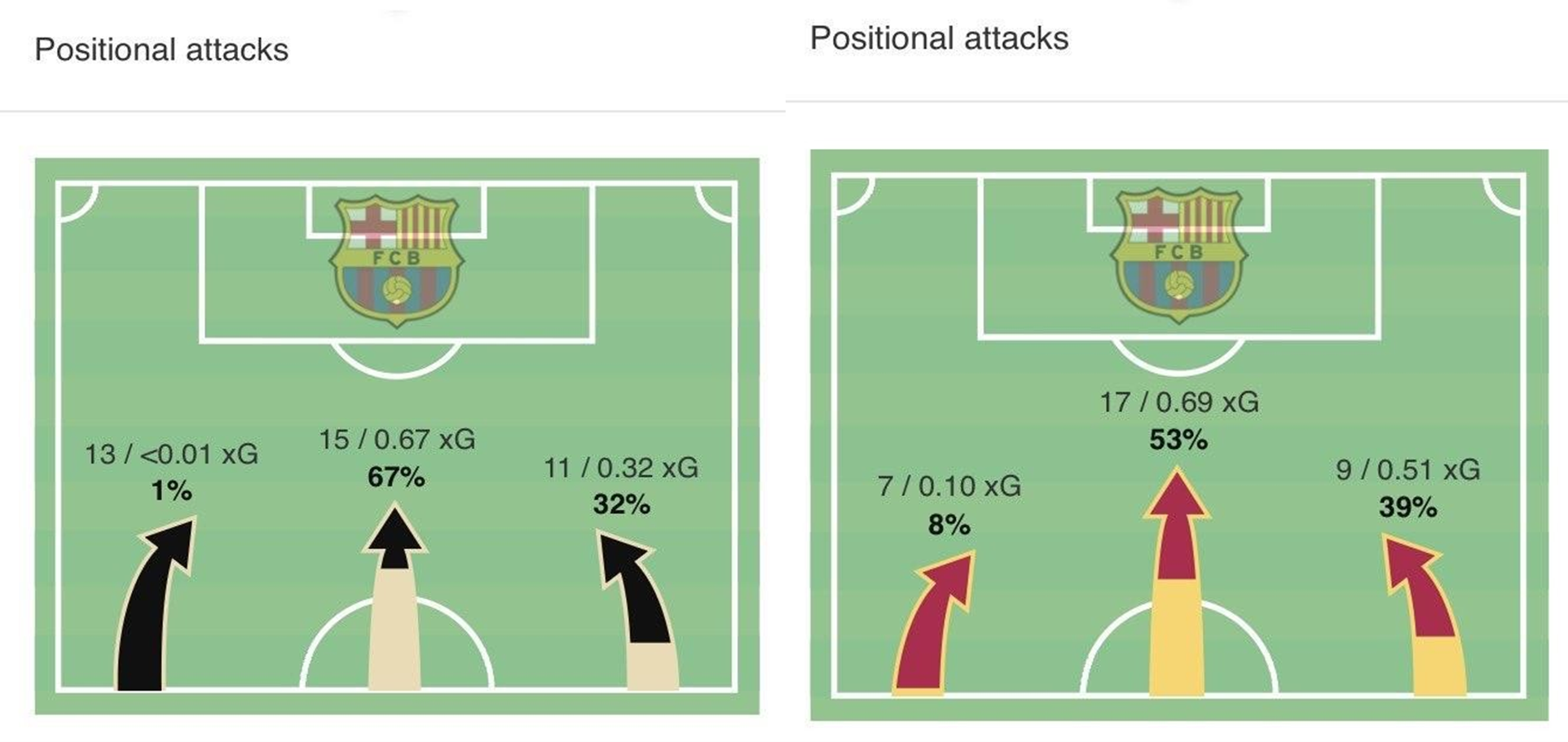 Nie będzie niczym odkrywczym pastwienie się nad sytuacją kadrową Dumy Katalonii, natomiast czy można liczyć na zjawiskową remontadę, gdy moce ofensywne z ławki wzmacnia Marcus Rashford, Roony Bardghji oraz Ronald Araújo? Bardzo ryzykowne założenie, wręcz abstrakcyjne. Anglik pomimo kilku bardzo obiecujących momentów, nadal wygląda jak ciało obce w systemie stworzonym przez niemca, Roony nie dostaje szans z ławki nawet na końcówki przesądzonych już spotkań, a Urugwajczyk nawet nie jest napastnikiem. Brak Raphinhi był bardzo odczuwalny, szczególnie w meczu rewanżowym, kiedy po zejściu Fermína Lopeza, lewa strona Barcy zaczęła przeciekać, jeszcze mocniej niż w pierwszej połowie, za sprawą miernej intensywności jaką wnosi Anglik, o ile wniósł jakąkolwiek w tym spotkaniu. Poza kwestią intensywności oraz pracy w defensywie, bez Brazylijczyka lewa flanka nie istniała ofensywnie (vide Tabela.1 oraz Tabela.2 poniżej). Oparcie na grze przez środek oraz akcjach indywidualnych Lamine